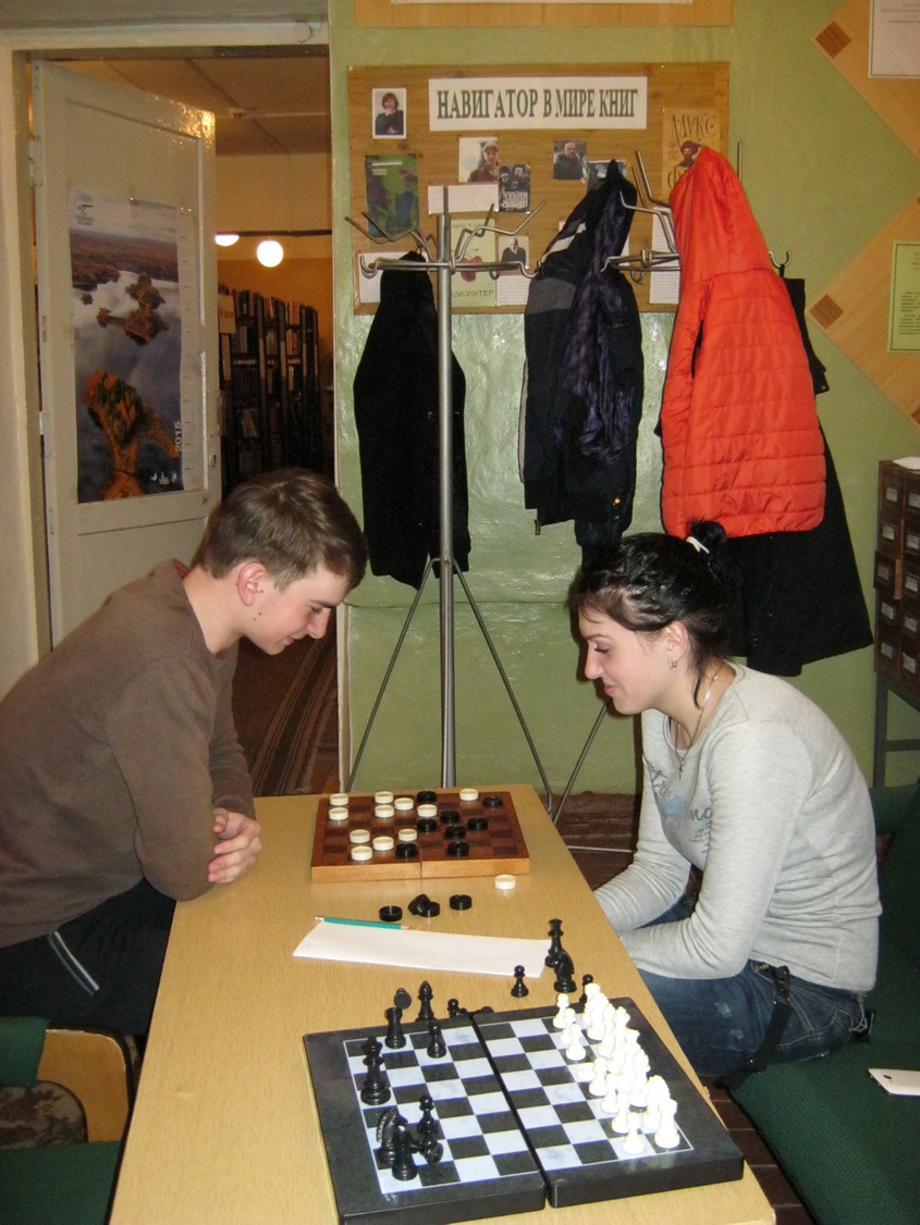 В каталожном зале была оборудована площадка настольных игр «Ужасно интересно все то, что не известно». Любители шахмат и шашек азартно сражались до последней фигуры на доске, самые юные участники осваивали развивающие игры «Исправь ошибку художника» и Экологическое лото; представители среднего возраста собирали из пазлов Восточный мегаполис и Царевну-лебедь, а также пели песни под гитару (аккомпанировали учащиеся 8 класса МБОУ СШ № 2 Кирилл Кирсанов, Никита Еремин, Александр Командиров).