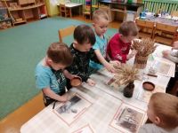 Малыши внимательно рассматривали настоящие хлебные колосья, зёрна и муку, с удовольствием «превратились» в маленькие зёрнышки во время весёлой физкультминутки «В землю зёрнышко упало», собрали математические пазлы «Что пекут из муки», а также сыграли в дидактическую игру «Хлебная тень».