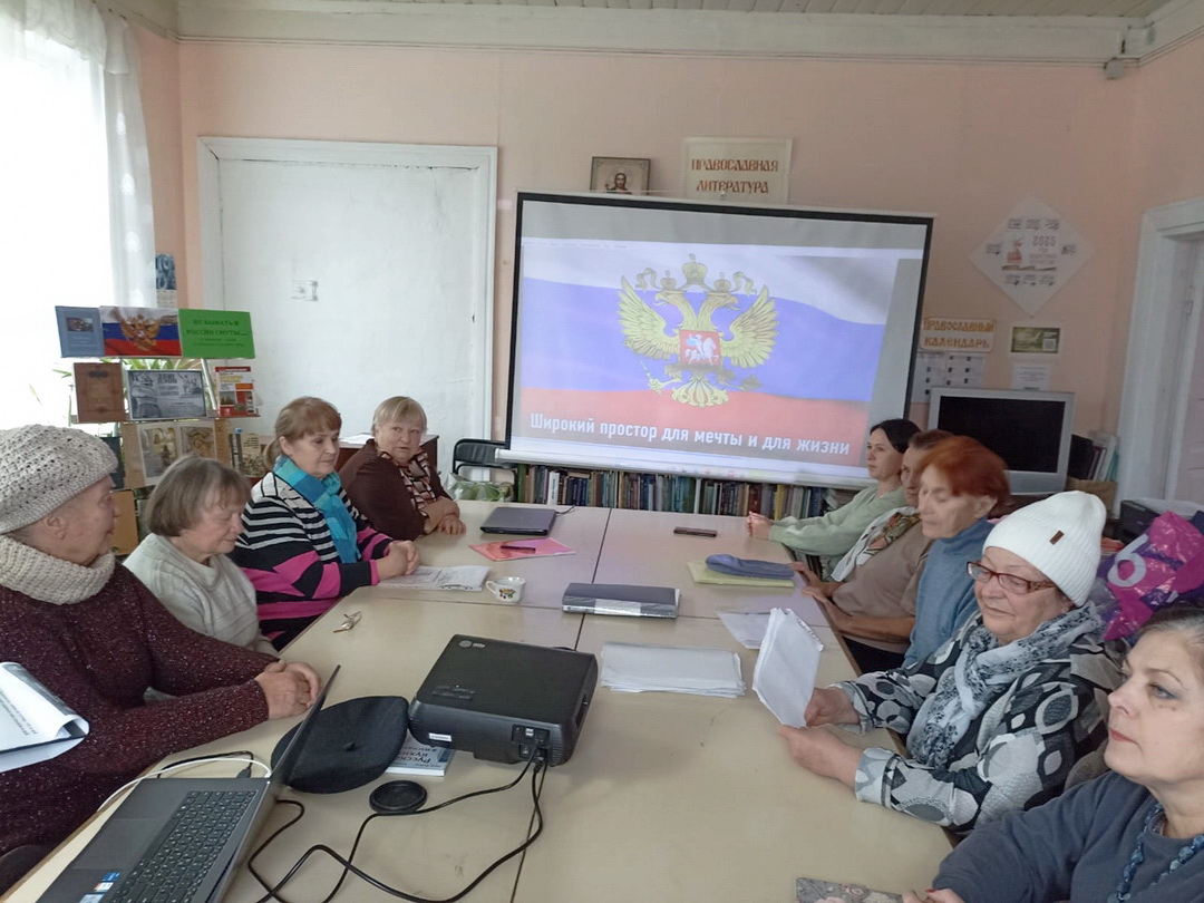 Встреча началась с исполнения Гимна России, затем библиотекарь Л.В. Гоголинская рассказала исторический контекст возникновения праздника, включая роль ополчения Минина и Пожарского в освобождении Москвы от польских интервентов XVII в.