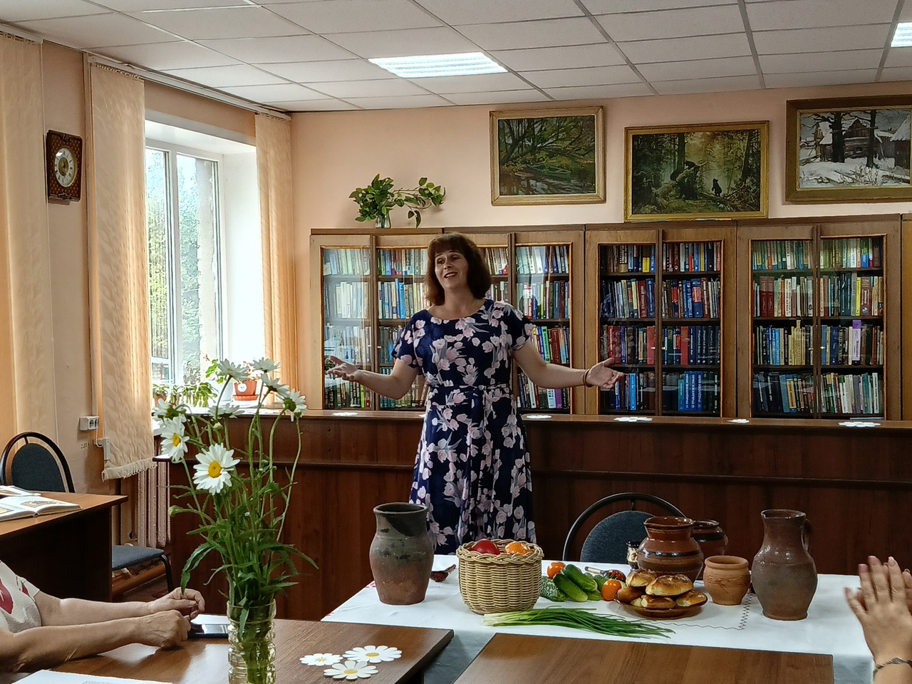 Библиотекарь рассказала историю праздника, показала видеофильм о святых Петре и Февронии Муромских. Так как тематика гостиной посвящена семейным обрядам, то читателям рассказали о важной роли и значении семейных обрядов, показали театрализованный отрывок из крестильного обряда